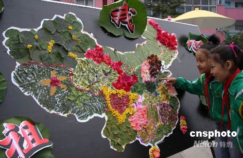 9月27日,山東省棗莊市市中區(qū)回民小學(xué)開展“我為祖國增紅添綠”創(chuàng)意活動,學(xué)生們巧妙地運用各種樹葉和鮮花制作出“中國地圖”,表達對偉大祖國的美好祝福,迎接國慶佳節(jié)。中新社發(fā) 吉 喆 攝