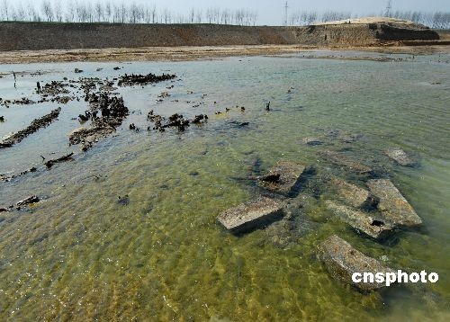 2009年3月25日,在京杭運(yùn)河山東臺(tái)兒莊段拍攝到的浮出水面的明朝古運(yùn)河船閘閘址。近日,一座在水下沉睡了400多年的古水工建筑遺址(古船閘)在京杭運(yùn)河臺(tái)兒莊段進(jìn)行河道疏浚工程時(shí)被發(fā)現(xiàn),這座古船閘位于新閘村北古運(yùn)河中心,船閘東西長約56米,南北約12米,古船閘的木樁繁多,條狀塊石可見,閘門樁基遺址清晰,據(jù)考證船閘修建于明朝萬歷年間,是明代泇運(yùn)河上的丁廟船閘,是棗莊段運(yùn)河(泇運(yùn)河)的八閘之一,距今400多年。此次古船閘的發(fā)現(xiàn),是繼頓莊船閘后的又一重大發(fā)現(xiàn),對(duì)古運(yùn)河棗莊段歷史和古水工建筑的研究具有非常重要的價(jià)值。中新社發(fā) 高啟民 攝