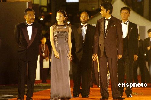 圖為開幕影片《夜鷹》男女主演大澤takao(前右)和竹內結子(前中)、導演成島出(前左)經紅地毯步入開幕式會場。