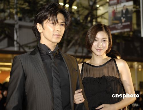圖為日本著名藝人廣末涼子(右)和武田真治亮相紅地毯。中新社發 侯宇 攝