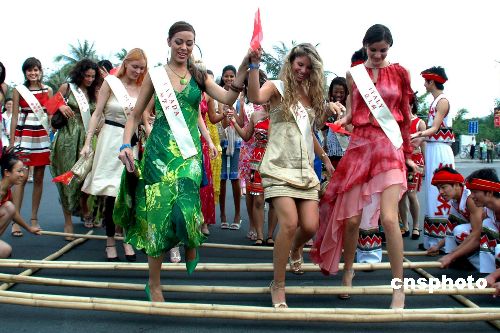 十一月十七日,參加第五十七屆世界小姐總決賽的一百多位佳麗參加了海南島歡樂節三亞分會場的活動,并在三亞市區巡游,與市民和游客們共享歡樂。中新社發 尹海明 攝