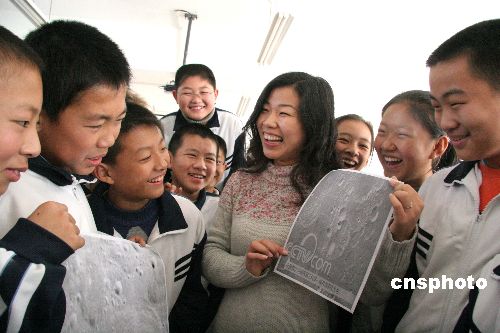 11月27日,威海古寨中學的學生上網查看“嫦娥一號”衛星傳回的第一幅月面圖像。當日,威海一中學開展“學科技激發航天熱”活動,同學們通過上網查看、老師講解、小組討論等形式了解“嫦娥一號”衛星及其相關的天文知識。中新社發 海云飛 攝