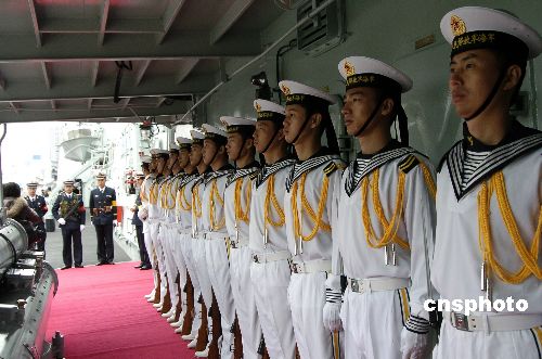 11月29日,中國“深圳”號(hào)導(dǎo)彈驅(qū)逐艦對(duì)日本的友好訪問進(jìn)入第二天,雙方進(jìn)行了高層拜訪、參觀軍艦、體育比賽等各種交流。圖為等待日本海上自衛(wèi)隊(duì)參謀長吉川榮治檢閱的“深圳”號(hào)艦上儀仗隊(duì)。中新社發(fā) 朱沿華 攝
