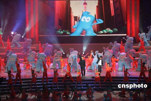 十二月十八日晚,備受海內外矚目的中國二0一0年上海世博會吉祥物在上海大舞臺揭開神秘面紗。一個返璞歸真的、漢字“人”的藍色卡通造型——吉祥物“海寶”正式亮相。“海寶”吉祥物的誕生,是海峽兩岸設計師共同的智慧結晶。其最初使用漢字充當吉祥物的創意始于臺灣知名設計師巫永堅,他的應征作品漢字卡通形象“大寶”在全球兩萬六千多件應征作品中脫穎而出,再經過上海設計名家邵隆圖及其團隊的整合、再設計,“海寶”最終定型。中新社發 潘索菲 海牛 攝