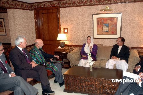 2007年12月27日,在自殺性爆炸襲擊發(fā)生前,巴基斯坦前總理貝·布托與阿富汗總統(tǒng)卡爾扎伊?xí)劇?
