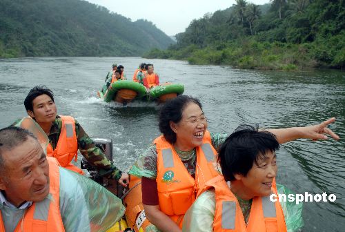 12月30日,一群參加海南萬泉河峽谷漂流的游客在出發(fā)前和工作人員一起宣誓做環(huán)保衛(wèi)士。2008新年到來之際,海南峽谷漂流生意愈加紅火,去五指山峽谷和萬泉河峽谷玩漂流的游客成倍增多。冬季仍如春夏的海南島成為不少人理想的游玩去處。中新社發(fā) 善平 攝
