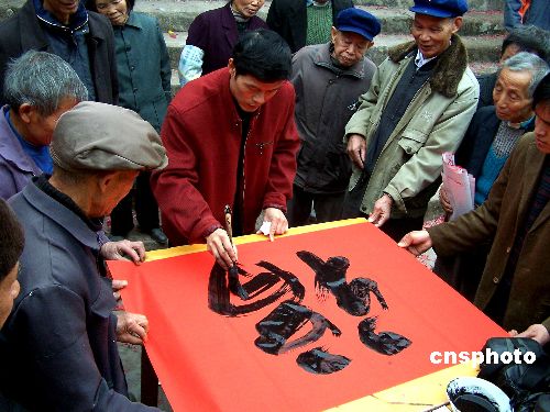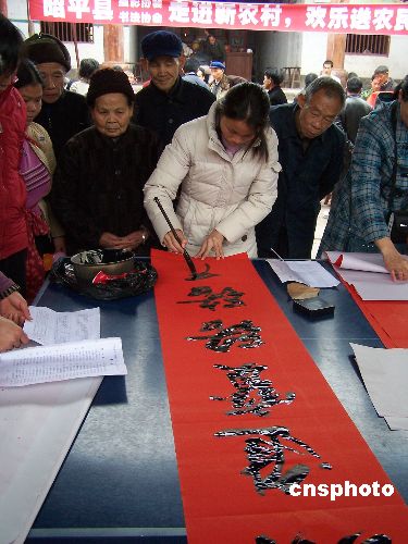 12月30日,書法家在仙回瑤族鄉伏龍村為瑤胞書寫春聯。當日,廣西昭平縣書法家協會10名書法家自帶筆墨紙張和伙食,驅車來到大山深處的仙回瑤族鄉伏龍村,現場為150戶瑤胞書寫春聯、贈送春聯,為瑤胞送來新年祝福。中新社發 喻湘泉 攝