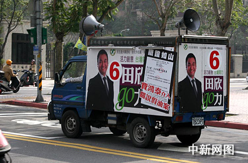 立委”候選人笑容可掬,但批評(píng)起競(jìng)選對(duì)手來(lái),那是該怎么的就怎么的。圖為一月十日上午行使駛在臺(tái)北街頭的一輛競(jìng)選文宣車。作者:陳立宇