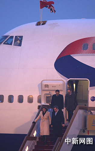 布朗和夫人薩拉一起走下舷梯。(中新社記者 盛佳鵬/攝)