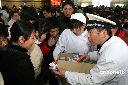 持續的大范圍災害性雨雪天氣給回鄉過春節的旅客帶來不便。2月5日,中國海軍上海保障基地派出醫療隊,冒著嚴寒來到上海火車站免費為旅客送醫送藥。中新社發 穆東祥 攝
