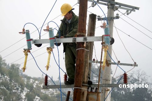 2月5日,婺源縣供電公司工作人員在贛浙皖邊界的江灣鎮大瀲村搶修。雪災造成江西省婺源縣山區大部分供電系統中斷,大山里的村民無法正常用電。國家電網公司江西省電力公司婺源縣供電公司立即組織“黨團員突擊搶修隊”和“電力110”搶修小分隊奔赴山區搶修線路。中新社發 王國紅 攝