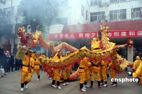 2月13日是春節后上班首日。湖北武漢江漢區常青街組織舞龍隊專程到轄區武漢社會福利院,為老人們做舞龍表演。中新社發 李長林 攝