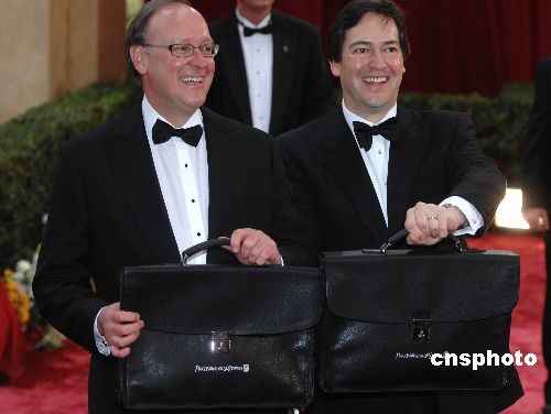 當(dāng)?shù)貢r(shí)間2月24日晚,第八十屆奧斯卡頒獎(jiǎng)典禮在好萊塢柯達(dá)劇場(chǎng)舉行。在奧斯卡金像獎(jiǎng)?lì)C獎(jiǎng)典禮開(kāi)始前,美國(guó)普華永道會(huì)計(jì)事務(wù)所的兩位會(huì)計(jì)師布萊德(左)和瑞克向記者展示兩個(gè)公文包,這里裝的就是奧斯卡各獎(jiǎng)項(xiàng)的最終結(jié)果。兩位會(huì)計(jì)師是最早知道奧斯卡結(jié)果的人。中新社發(fā) 張煒 攝