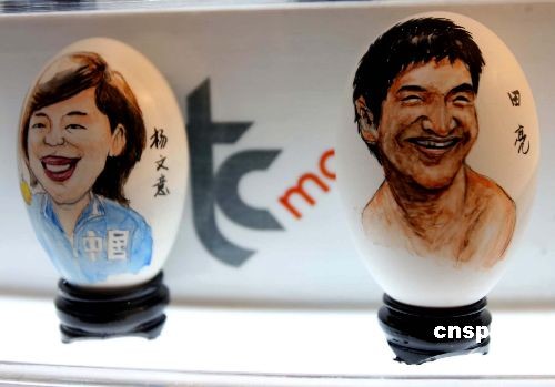 近日,香港世貿中心以奧運為主題,配合傳統民間藝術舉辦“復活蛋藝展”,給香港觀眾帶來充滿特色的蛋藝展覽。三部分二百件的彩繪蛋畫、蛋雕和卵石畫作品栩栩如生。圖為奧運金牌風云人物田亮、楊文意蛋雕。中新社發 洪少葵 攝