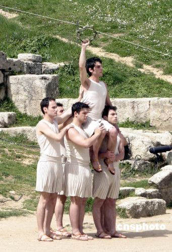 希臘當(dāng)?shù)貢r間3月24日,北京二00八年奧運(yùn)會圣火采集儀式在古奧林匹亞競技場舉行,最高女祭司順利采集到火種,圖為采集儀式上五名男祭司表演。中新社發(fā) 王歡 攝