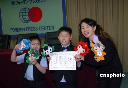 年僅9歲的東京都市立小學二年級學生布施望(中)以《五環夢》為題的漢語作文獲得學生組一等獎。中新社發 段躍中 攝