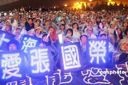 三月三十一日,香港文化中心舉行Live Moments·張國榮拉闊時光露天播放會,紀念張國榮逝世五周年。圖為觀眾在雨中觀看影片。中新社發 武仲林 攝