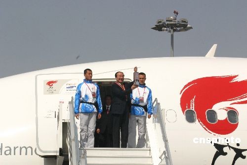 當(dāng)?shù)貢r(shí)間4月1日下午1點(diǎn)13分,北京奧運(yùn)圣火包機(jī)“奧運(yùn)圣火號(hào)”抵達(dá)阿拉木圖國(guó)際機(jī)場(chǎng)。北京奧運(yùn)會(huì)圣火將從那里開(kāi)始境外傳遞的首航。4月2日,奧運(yùn)圣火將在阿拉木圖進(jìn)行六個(gè)小時(shí)的傳遞。圖為北京奧組委執(zhí)行副主席蔣效愚(中)手提圣火燈走下飛機(jī)。 中新社發(fā) 沈晨 攝