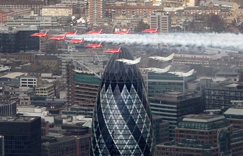 英國皇家空軍4月1日舉行飛行表演,“紅箭”飛行表演隊的飛機和4架“臺風”戰(zhàn)機飛過倫敦上空,紀念皇家空軍建立90周年。