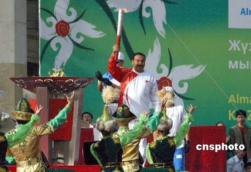 2000年奧運會拳擊冠軍葉爾馬罕·伊布拉莫夫用手中的火炬點燃圣火盤后,展示手中的火炬。沈晨攝