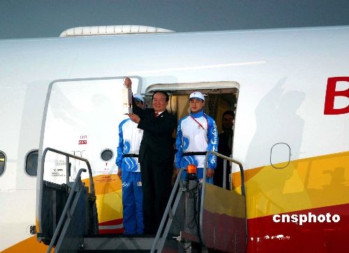 4月5日晚7時25分,載有北京奧運祥云圣火的“奧運圣火號”飛抵英國首都倫敦。倫敦人對圣火的到來極為重視,奧運事務(wù)大臣等重要官員悉數(shù)抵達機場迎接。圖為北京奧組委執(zhí)行副主席蔣效愚(中)手提圣火燈走下飛機。 中新社發(fā) 沈晨 攝