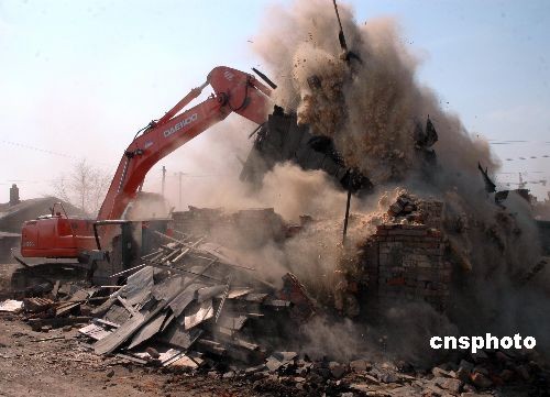 4月8日,黑龍江省黑河市城市管理行政執法局及有關部門對東部棚戶區部分拒不履行搬遷義務的被拆遷戶依法定程序實施強制拆遷。中新社發 邱齊龍 攝