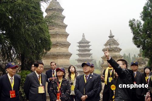 四月八日,黃埔老兵們在河南少林寺塔林參觀。當日,由臺灣及大陸近百名退役將軍組成的“海峽兩岸百名將軍黃帝故里拜祖大典”參訪團在河南嵩山少林寺參觀訪問。中新社發 李志全 攝