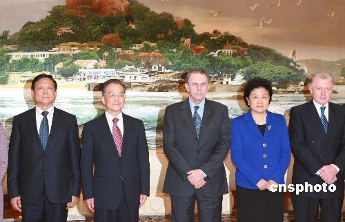 四月九日,中國國務院總理溫家寶在北京人民大會堂會見國際奧委會主席羅格(左三),國務委員劉延東(右二)、北京奧組委主席劉淇(左一)等參加了會見。中新社發 廖文靜 攝