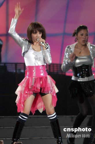 4月10日,在以“牡丹盛開迎奧運”為主題的河南省第26屆洛陽牡丹花會慶典晚會上,臺灣人氣歌手蔡依林、潘瑋柏激情獻唱。中新社發 張曉理 攝