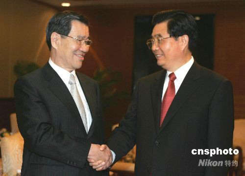 4月12日下午,中共中央總書記胡錦濤在海南省博鰲會見出席博鰲亞洲論壇2008年會的兩岸共同市場基金會董事長蕭萬長一行。中新社發 任晨鳴 攝