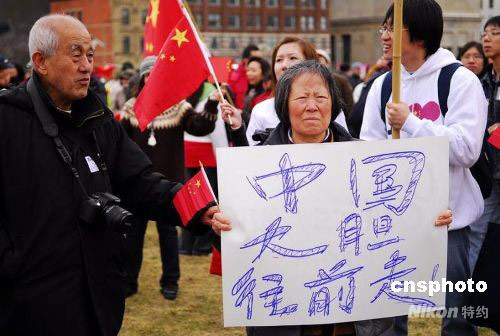 當地時間2008年4月13日下午,來自加拿大各地的近萬名華人聚集在首都渥太華國會山廣場,舉行“宣傳西藏真相、維護祖國統一”大型集會活動。集會全程充滿“和平、友愛”的熱烈氣氛,組織者宣讀了中英文集會聲明和致加拿大總理哈珀公開信,表達海外華人“支持一個中國、支持北京奧運會,反對暴力”的心愿。中新社發 楊碩 攝