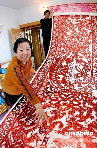 4月14日,由沈陽市民王玉芬創作的《百龍迎奧運》巨幅剪紙作品亮相沈陽,這幅剪紙作品長11米,高1.2米,由王玉芬耗時兩年時間創作完成,整幅作品由100條形態各異的龍與奧運標識組成,表達龍的子孫遙祝北京奧運會的成功舉辦。 中新社發 羅瀾 攝
