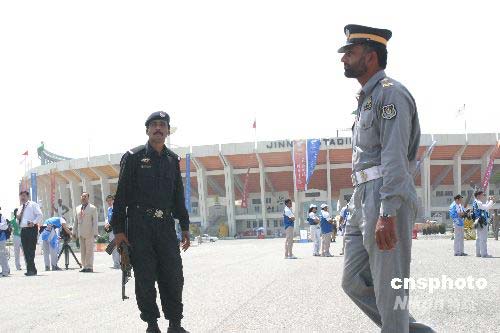 圖巴基斯坦警察在舉行起跑儀式和慶典儀式的巴基斯坦體育中心附近巡邏。作者: 沈晨