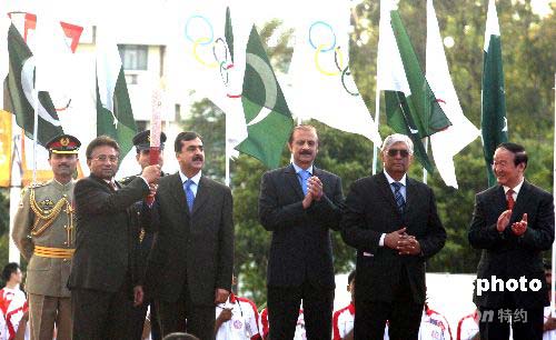4月16日下午5時,巴基斯坦曲棍球隊前隊長義夫拉·汗從巴基斯坦總統穆沙拉夫和總理吉拉尼兩人手中接過第一棒“祥云”火炬,北京奧運圣火開始在巴基斯坦首都伊斯蘭堡傳遞。圖為巴基斯坦總統穆沙拉夫、總理吉拉尼共舉火炬。作者: 沈晨
