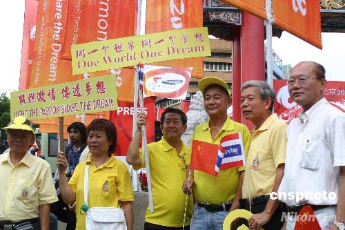 4月19日下午3時(shí)15分,祖籍中國(guó)海南的泰國(guó)第二代華裔阿南·詩(shī)里帕差臘蓬從曼谷市市長(zhǎng)阿皮拉手中接過“祥云”火炬,北京奧運(yùn)圣火在此間的傳遞正式開始。北京奧運(yùn)圣火在曼谷的傳遞約10.8公里,共有80名火炬手,其中泰籍華人占一半以上。火炬自唐人街中華門出發(fā)后,途經(jīng)臥佛寺、大王宮、民主紀(jì)念碑、集拉達(dá)王宮、阿南達(dá)王宮等曼谷著名景點(diǎn)后,最終在五世王銅像廣場(chǎng)舉行慶典儀式。圖為華人華僑在圣火傳遞沿途舉牌助威。 中新社發(fā) 沈晨 攝