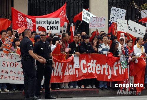 當(dāng)?shù)貢r(shí)間4月19日,洛杉磯爆發(fā)十幾年來最大規(guī)模的華人華僑抗議示威活動(dòng)。數(shù)千名華人華僑和留學(xué)生在CNN洛杉磯分部門前參加和平示威,要求CNN向公開鄭重道歉,并開除卡弗蒂。示威活動(dòng)自始至終秩序井然,現(xiàn)場(chǎng)執(zhí)勤警察一臉輕松。中新社發(fā) 張煒 攝