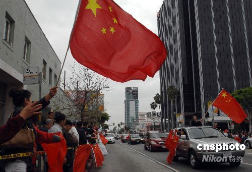 當地時間4月19日,洛杉磯爆發十幾年來最大規模的華人華僑抗議示威活動。數千名華人華僑和留學生在CNN洛杉磯分部門前參加和平示威,要求CNN向公開鄭重道歉,并開除卡弗蒂。圖為抗議者駕車揮舞五星紅旗。中新社發 張煒 攝