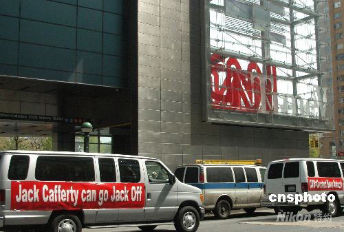 紐約華人社團二十一日租用多輛巴士,懸掛抗議CNN口號的標語,圍繞美國有限電視新聞網(CNN)駐紐約辦公大樓周圍行駛,強烈抗議CNN辱華報道。中新社發 李靜 攝