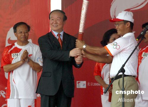 圖為北京奧組委執行副主席蔣效愚(左二)向雅加達省政府贈送“祥云”火炬。 沈晨 攝