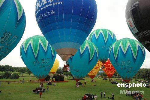 四月二十八日,海口熱氣球節,來自全國的四十支熱氣球隊攪熱椰城,近千名市民爭乘熱氣球體驗升空感受。中新社發 王辛莉 攝