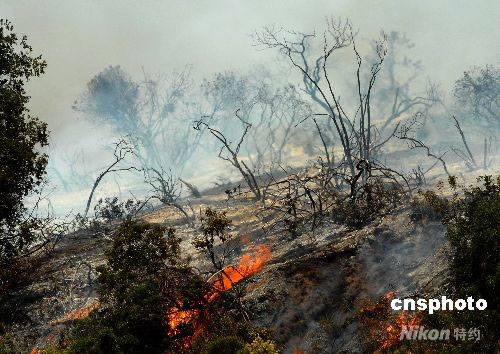 洛杉磯附近Sierra Madre的山林大火已經燃燒了三天,過火面積近五百英畝。中新社發 張煒 攝
