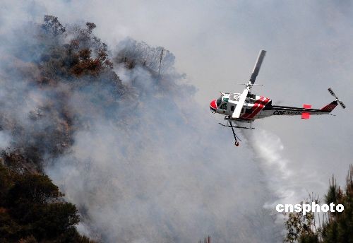 當(dāng)?shù)貢r(shí)間四月二十八日,消防直升機(jī)正在向著火區(qū)域撒下阻燃劑。中新社發(fā) 張煒 攝