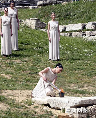 希臘當?shù)貢r間3月24日,北京二00八年奧運會圣火采集儀式在古奧林匹亞競技場舉行,最高女祭司用順利采集到火種引燃手中的火炬。中新社記者 王歡 攝