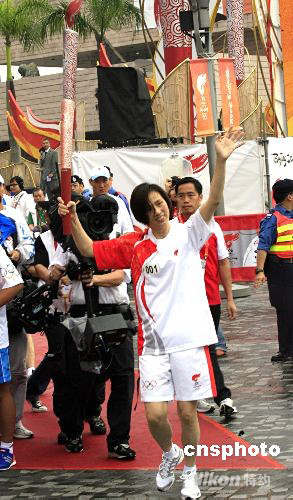 香港滑水風(fēng)帆奧運冠軍李麗珊接過第一棒火炬,開始圣火傳遞。中新社發(fā) 王麗南 攝