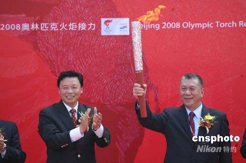 圖為澳門特別行政區(qū)行政長官何厚鏵(右) 、北京奧組委執(zhí)行副主席楊樹安等出席起跑儀式。中新社發(fā) 武仲林 攝