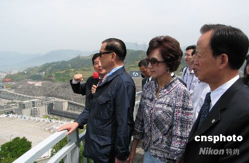 五月四日,中國國民黨榮譽主席連戰偕夫人連方瑀,參觀訪問三峽大壩,并欣然為三峽工程題詞:“造奇工,利天下!边B戰對三峽工程發揮的巨大效益表示欽佩,稱贊三峽工程是中華兒女共同的榮耀。中國國民黨副主席林豐正、海協常務副會長李炳才以及湖北省、宜昌市等當地有關人員陪同參觀訪問。中新社發 艾啟平 攝