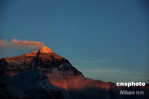 5月5日,夕陽下的珠穆朗瑪峰如燃燒的火炬。中新社發 盛佳鵬 攝