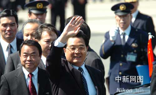 當地時間5月6日下午1點45分左右,中國國家主席胡錦濤乘專機抵達日本羽田機場,開始對其為期5天的國事訪問。圖為胡錦濤在機場向歡迎人群揮手致意。中新社記者 朱沿華 攝