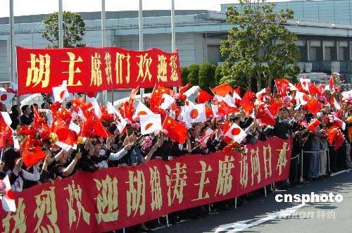 當?shù)貢r間5月6日下午1點45分左右,中國國家主席胡錦濤乘專機抵達日本羽田機場,開始對其為期5天的國事訪問。圖為240多名在日華僑華人趕到機場熱烈歡迎胡主席的到來。中新社發(fā) 朱沿華 攝