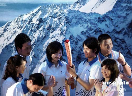 奧運圣火傳遞火炬手演藝明星陳坤、聯想集團副總裁李嵐等在珠穆朗瑪峰巨幅招貼畫前端詳祥云火炬。中新社發 廖攀 攝